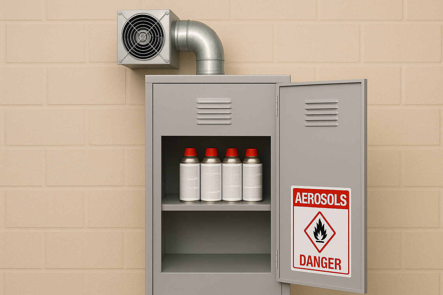 Aerosols should always be kept in a well-ventilated room or cabinet so that vapours don’t build up and create a fire risk. Avoid using sealed cupboards unless they’re fitted with proper vents or an extraction system to let gases escape effectively.