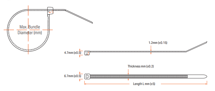 | GTSE SKU | Colour | Width W (mm) | Thickness (mm) | Length L (mm) | Max. Bundle Diameter (mm) | Min. Tensile Strength (kg) |